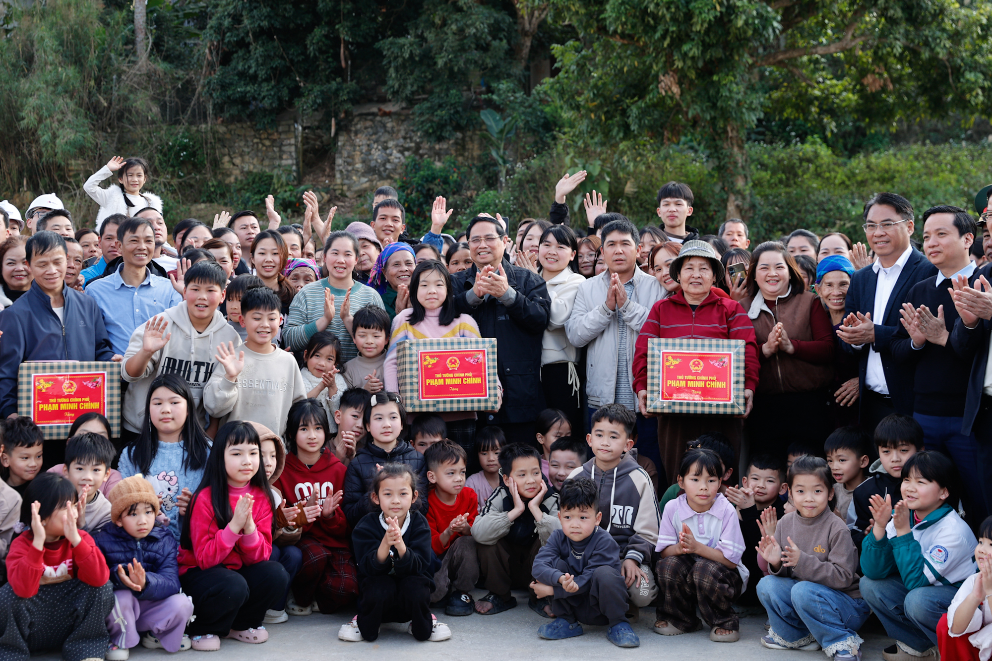 Thủ tướng tặng quà các gia đình trong khu tái định cư – Ảnh: VGP/Nhật Bắc